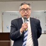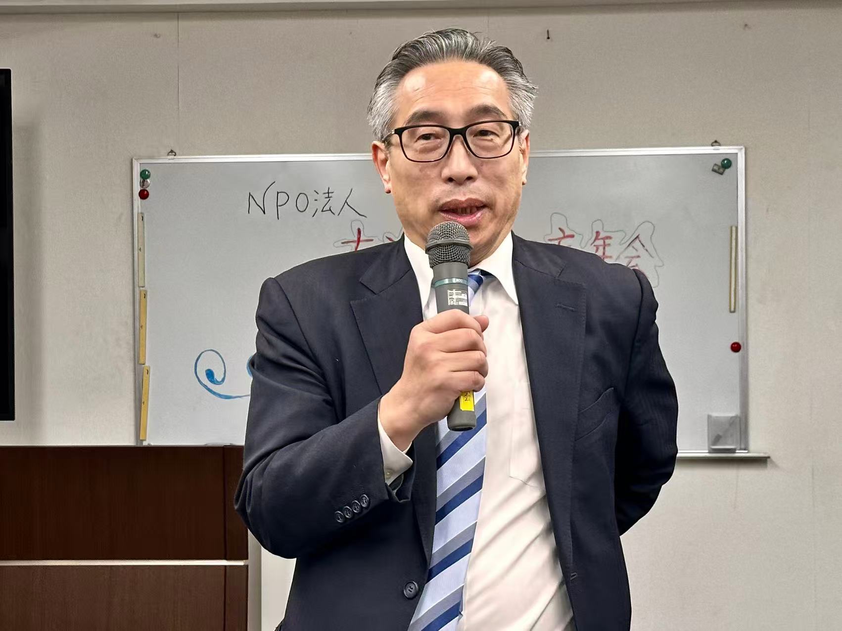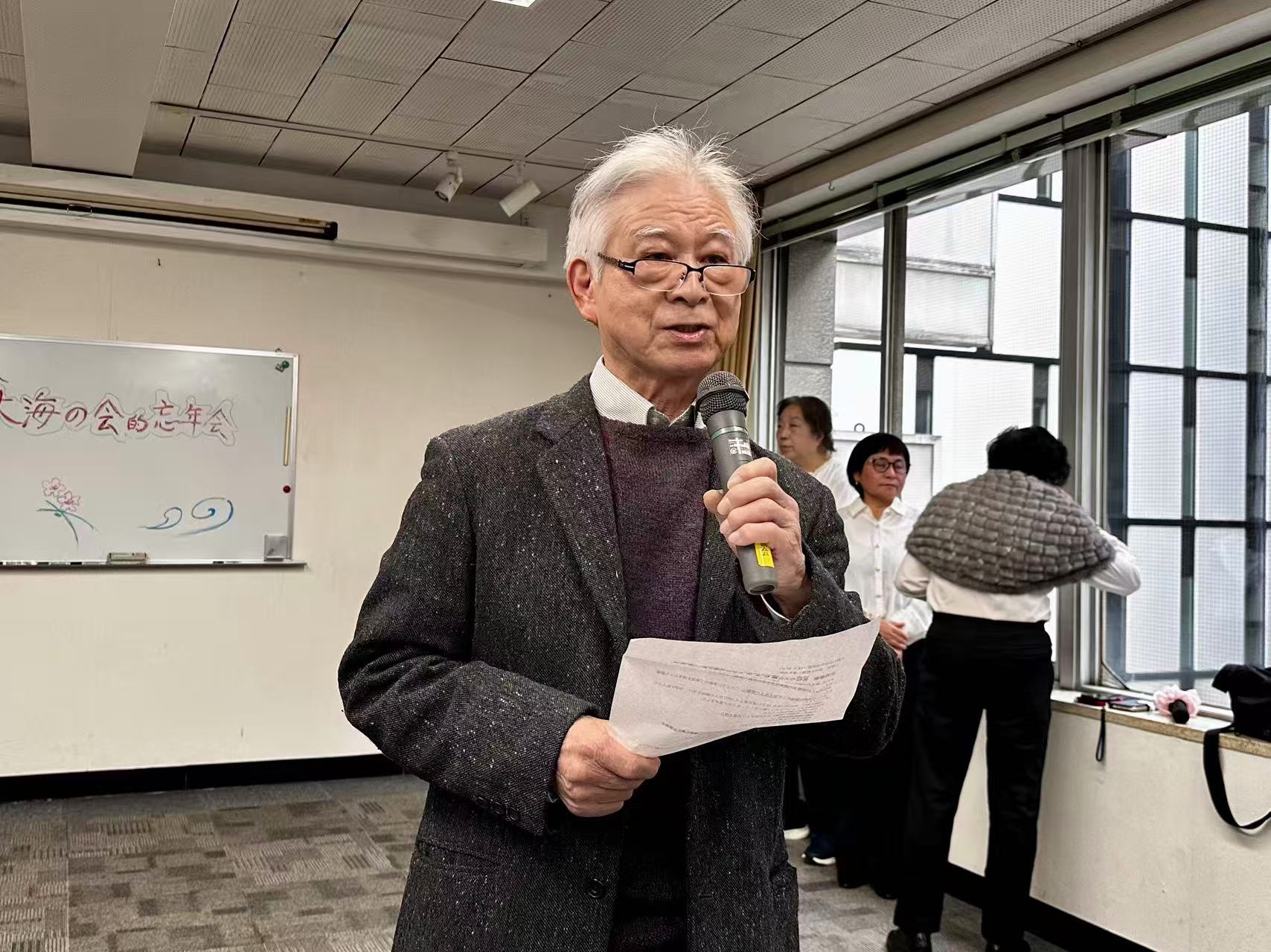 忘年会は、田中佑貴江理事長の司会ではじまりました。最初に、中野修会長の挨拶は「11月7日、高市首相発言で日中関係に新たな緊張をもたらしました。中国は、内政干渉と猛反発しており、私たちは、こうした事態に憂慮しています。日本政府は、一日も早くこの事態の改善を図るよう求める」と発言しました。