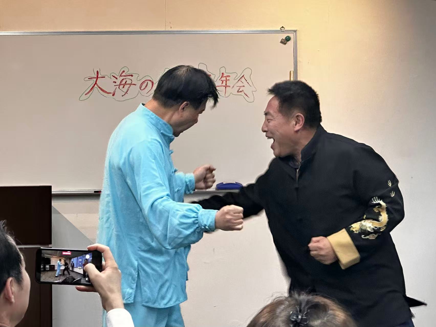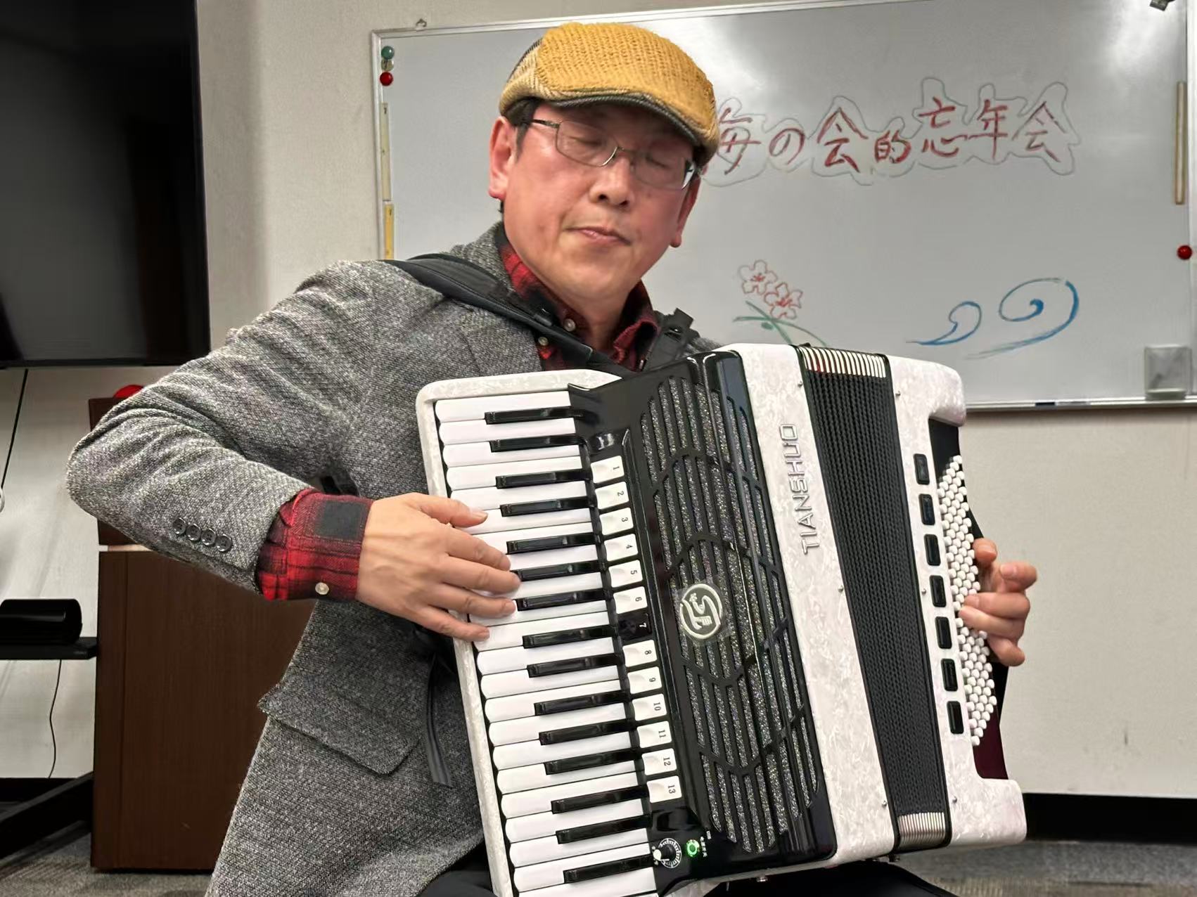 曹小冬氏のアコーディオン伴奏は、日本、中国の歌を約300曲近く奏でられるとのことで、リクエストに応えて皆で合唱したり、懐かしい「天安門」、「北国の春」などの歌が出しました。また、中国武術家協会の潘暁東氏によって演武などが披露されました。
