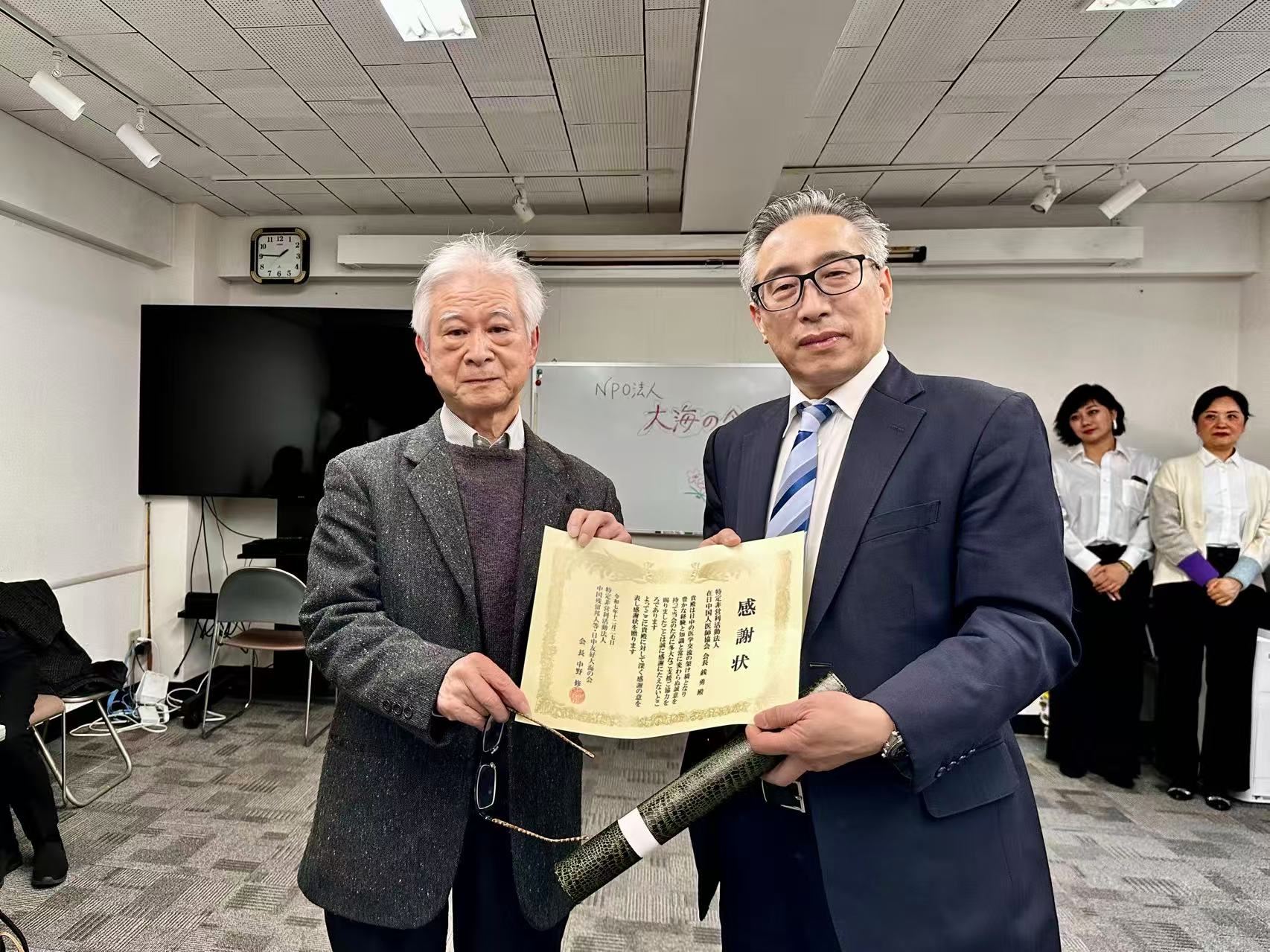 大海の会に対しまして、いつもご支援ご協力をして頂いている在日中国人医師協会銭勇会長に心を込めて感謝状を贈りました。